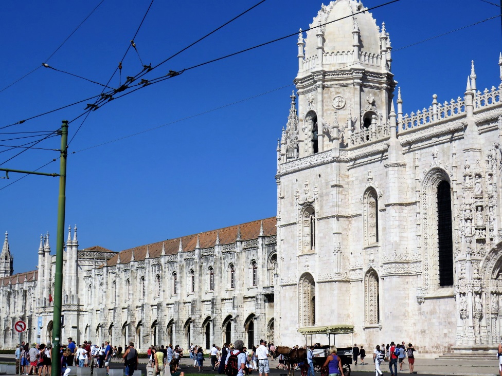 Jeronimo-klosteret blev grundlagt i 1502 og er et enestående eksempel på den specielle portugisiske “manuelinske” stil. Stilen fik navn efter den konge, der regerede og byggede i den første store blomstringstid, nemlig perioden 1490 – 1540 og klosteret kan ses på billedet ovenfor. Det tog næsten 100 år at bygge det færdigt. I kirken hviler flere portugisiske konger, bl.a. netop Kong Manuel I som lod bygge klosteret, ligesom der findes sarkofager for Vasco da Gama og Portugals nationaldigter Luis de Camões 1525 – 1580.