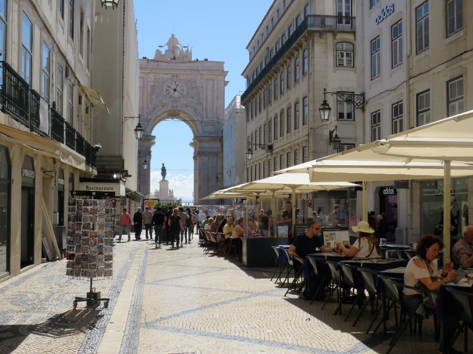 Den berømte gågade Augusta-gade fører ned til Handels-pladsen “Praça do Comercio” igennem den mægtige triumfbue og den er fyldt med restauranter. Bevæger du dig lidt ud i sidegaderne ligger der også her mange restauranter, hvor portugiserne selv går hen, og hvor de ofte bestiller dagens ret til frokost.
